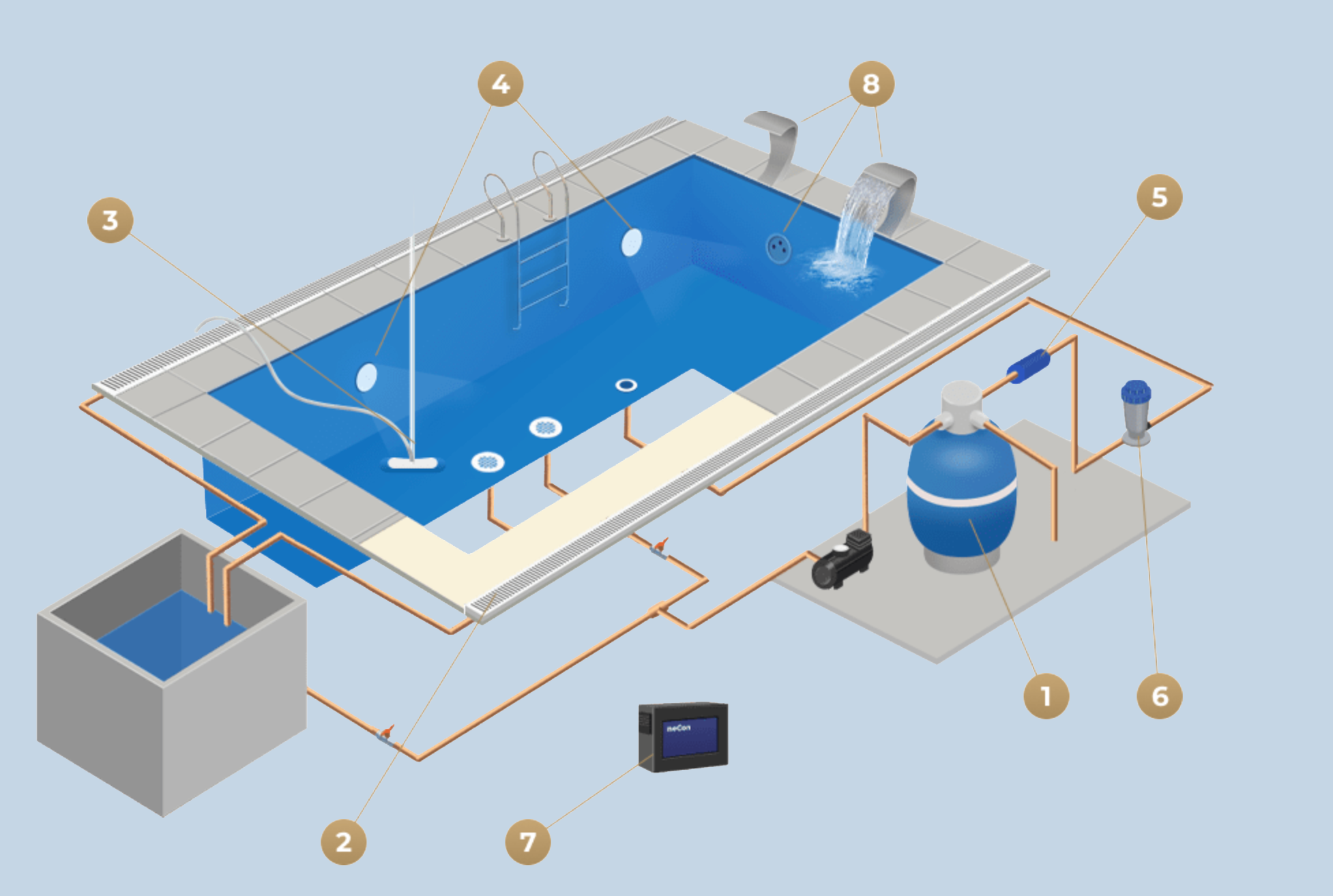 описание:бассейн полностью автономен, установлена автоматическая обратная промывка фильтра, автоматическая станция дозирования по PH, свободному CL, REDOX. дистанционный контроль и управление за всеми показателями в том числе количеством химии